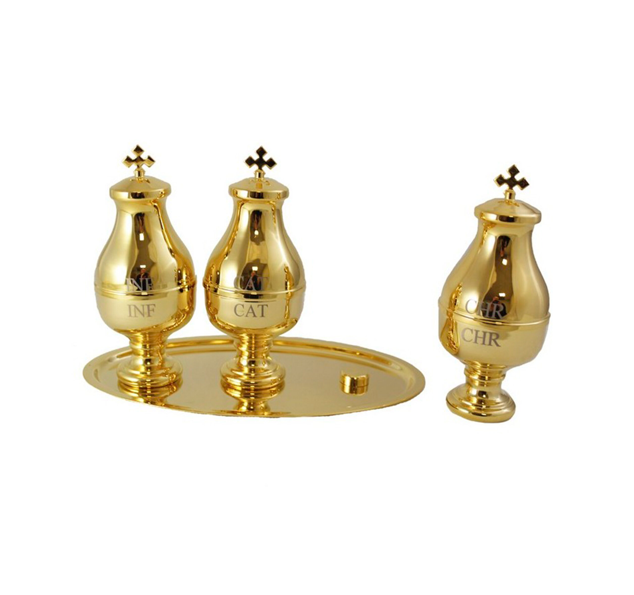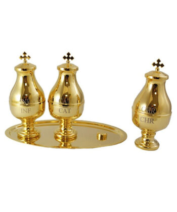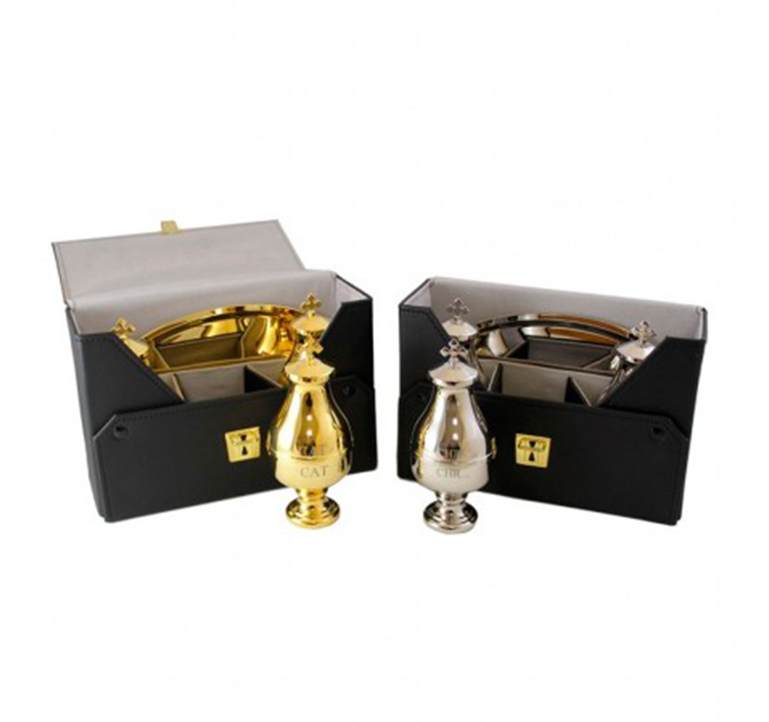 Las crismeras, elaboradas en metal, incluyen una bandeja del mismo color y material, logrando un conjunto visualmente homogéneo, coordinado y de gran presencia litúrgica. El acabado metálico aporta sobriedad y solemnidad, valores propios de los objetos destinados al culto y la celebración sacramental.