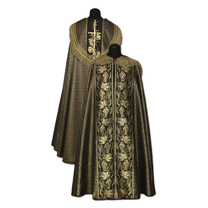 Espectacular capa pluvial sacerdotal de color negra con preciosos adornos litúrgicos.