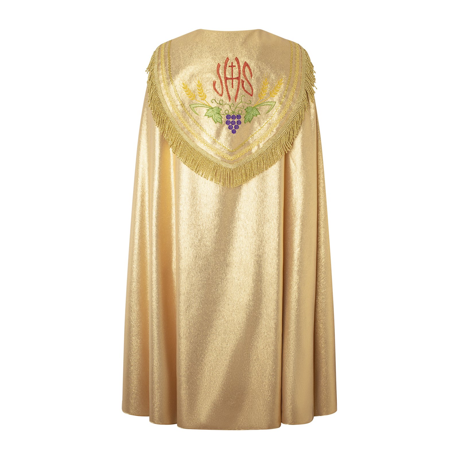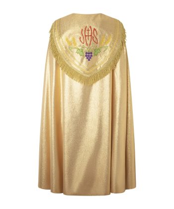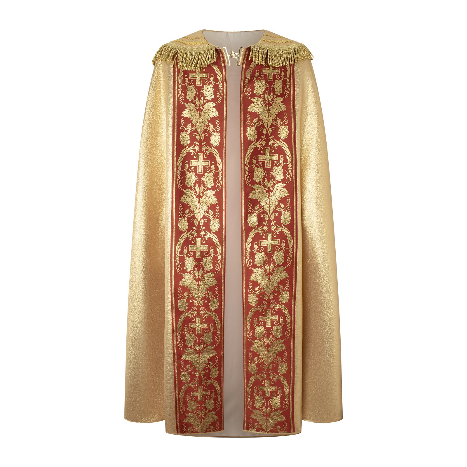 Si deseas comprar una capa pluvial espectacular a un precio bajo esta es una muy buena opción. Estolón rojo, matices rojo y verde en la parte de atrás, tela dorada. Decorada con cruz holas y uvas.