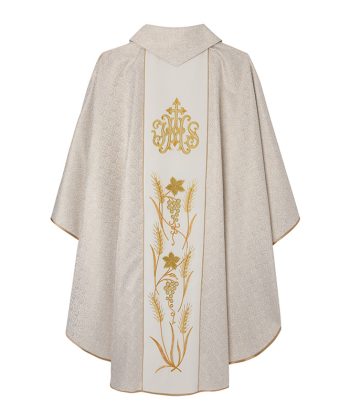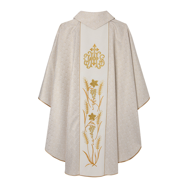Casulla dorada de San José y el niño, fabricada en una tela dorada tipo tisu y un estolón blanco roto con decoraciones bordadas de espigas y uvas y la imagen de San José y el niños Jesús.