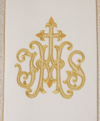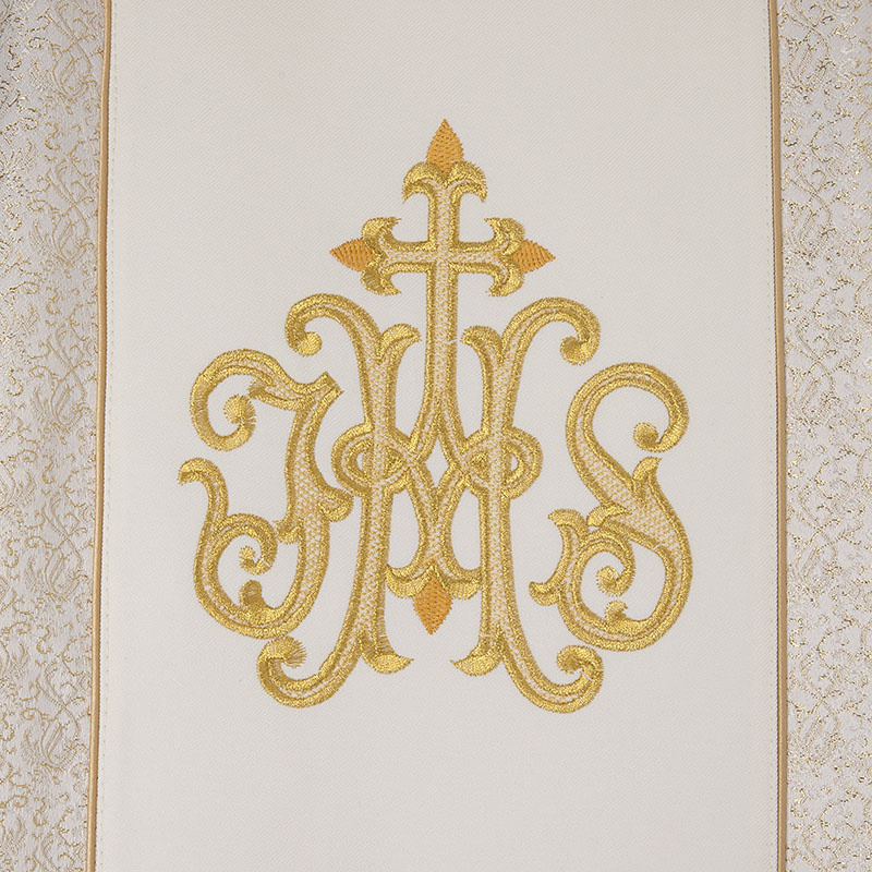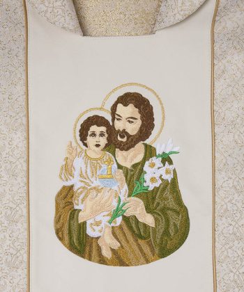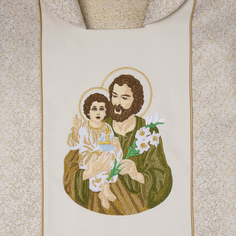 Casulla blanca de tela dorada y estolón blanco con bordado de figura de San José y el niño Jesús.