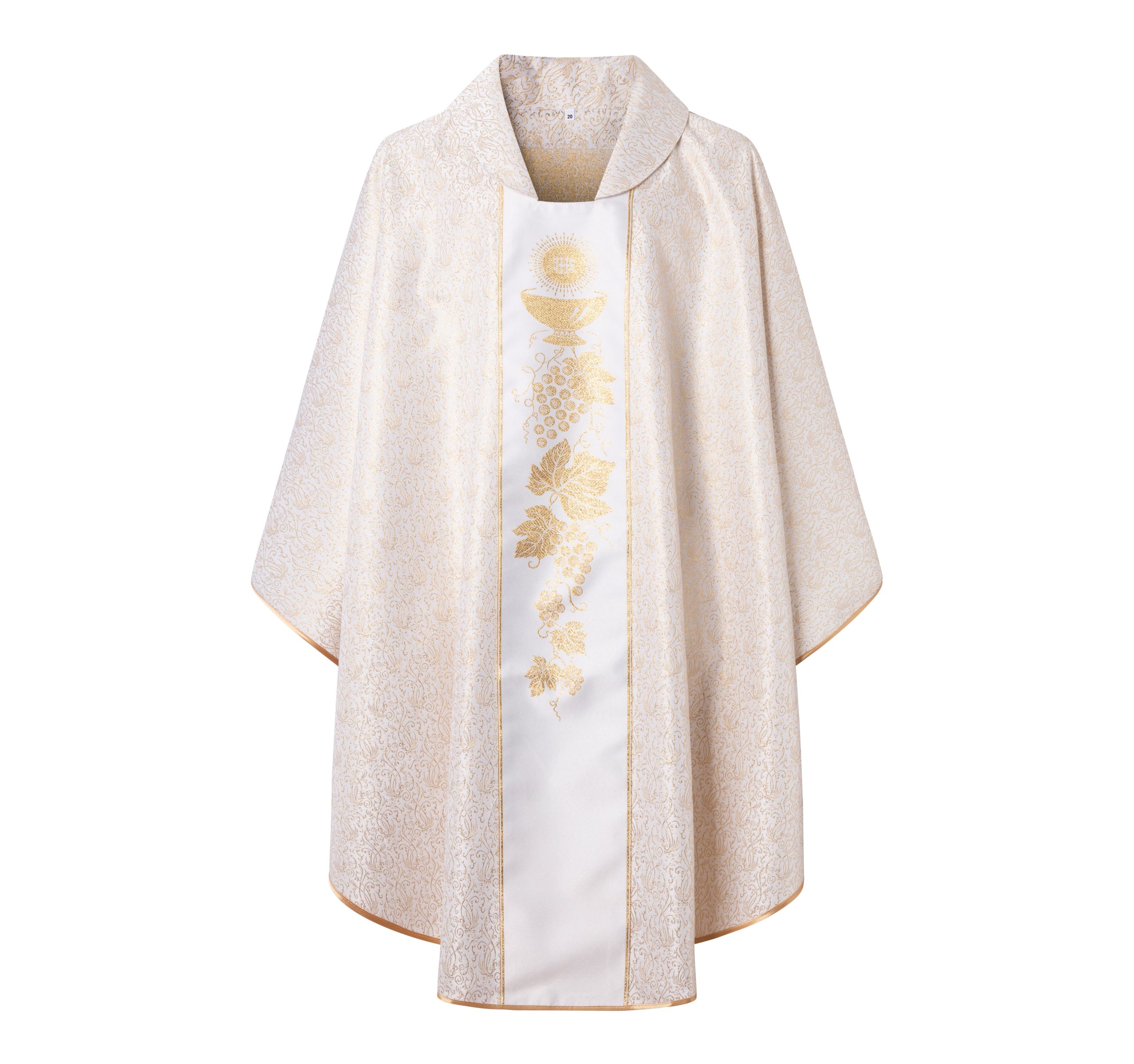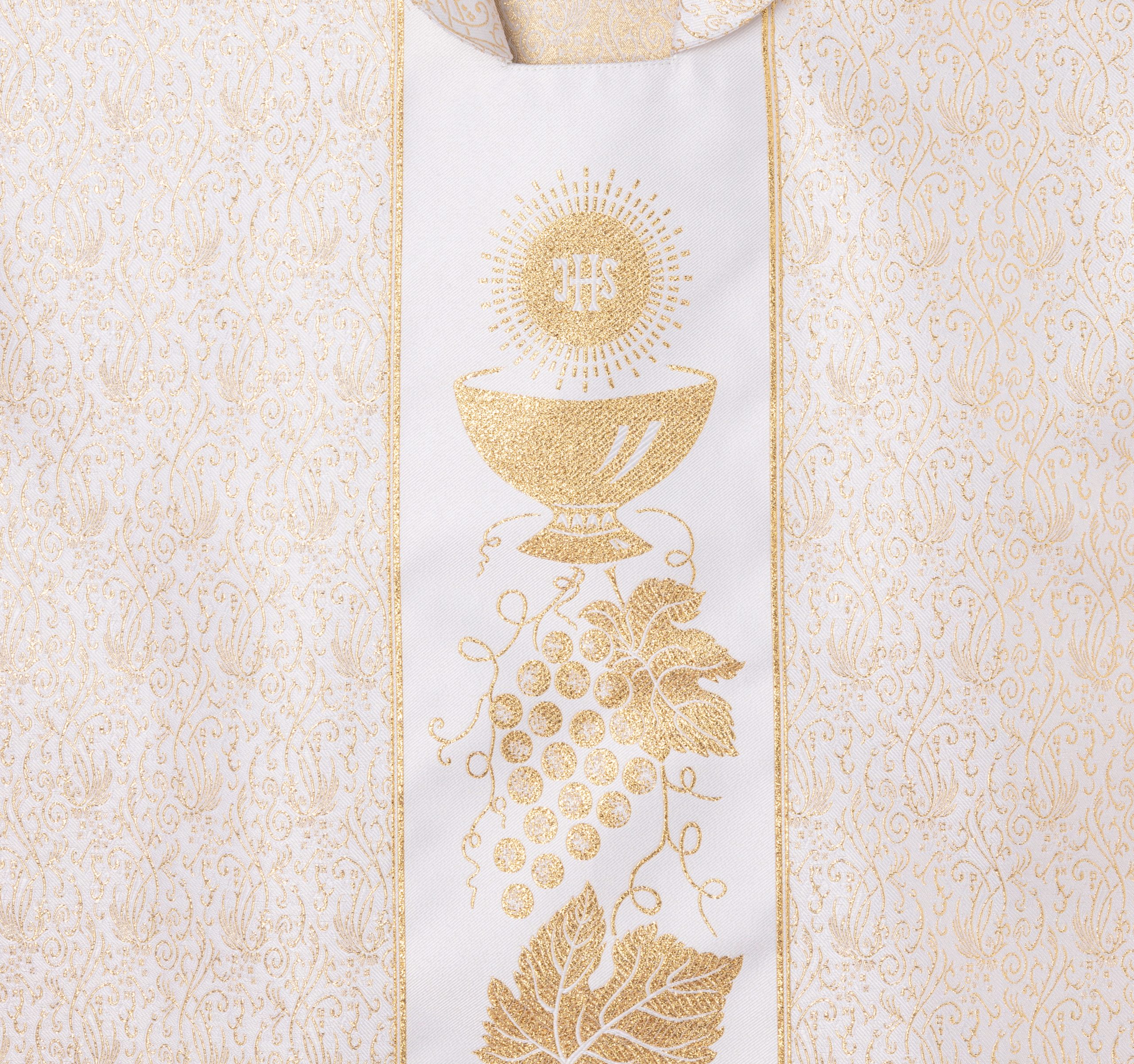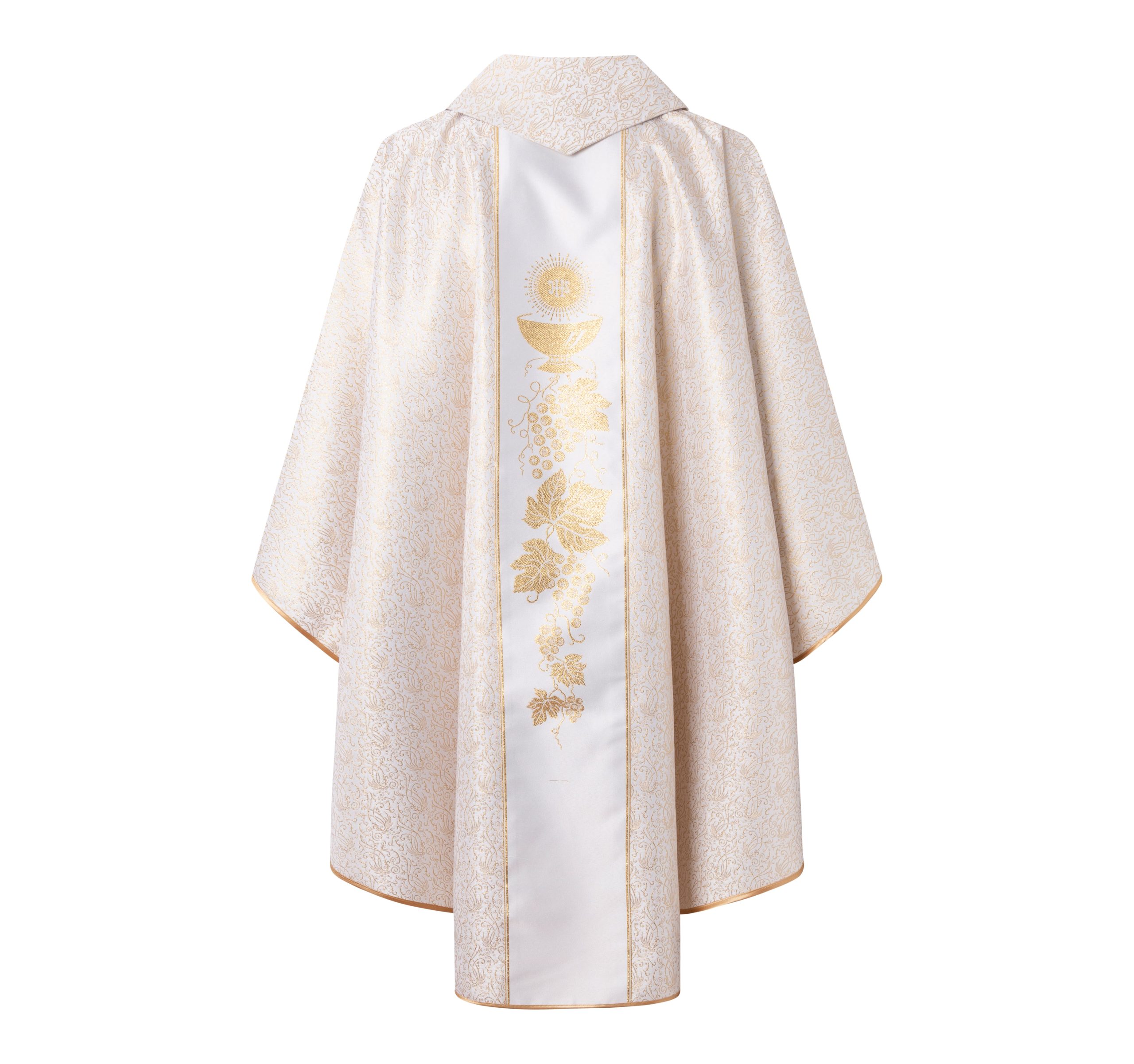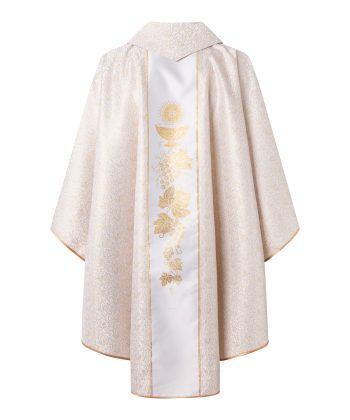 Casulla de sacerdote marrón con franja blanca de cáliz y uvas.