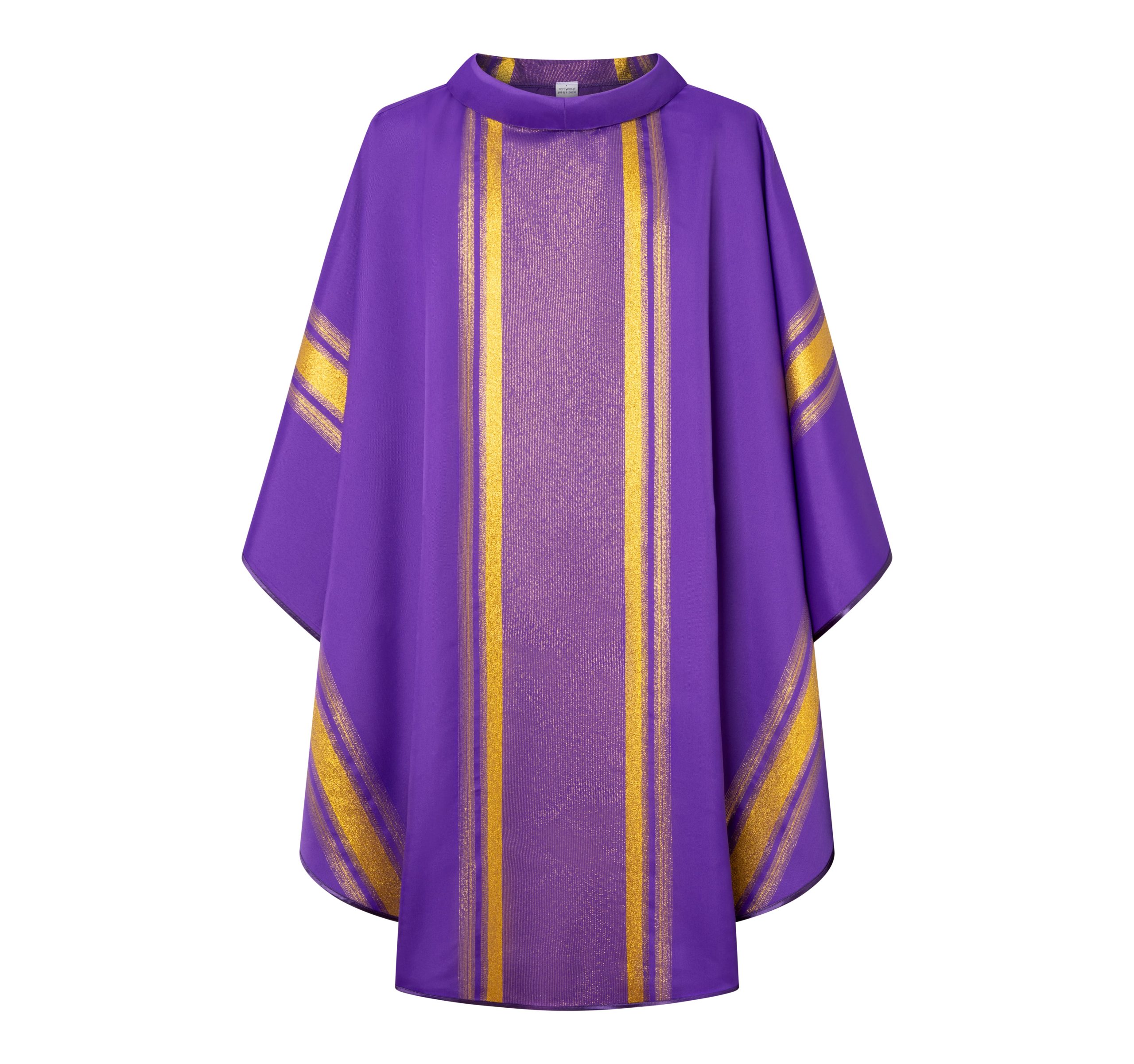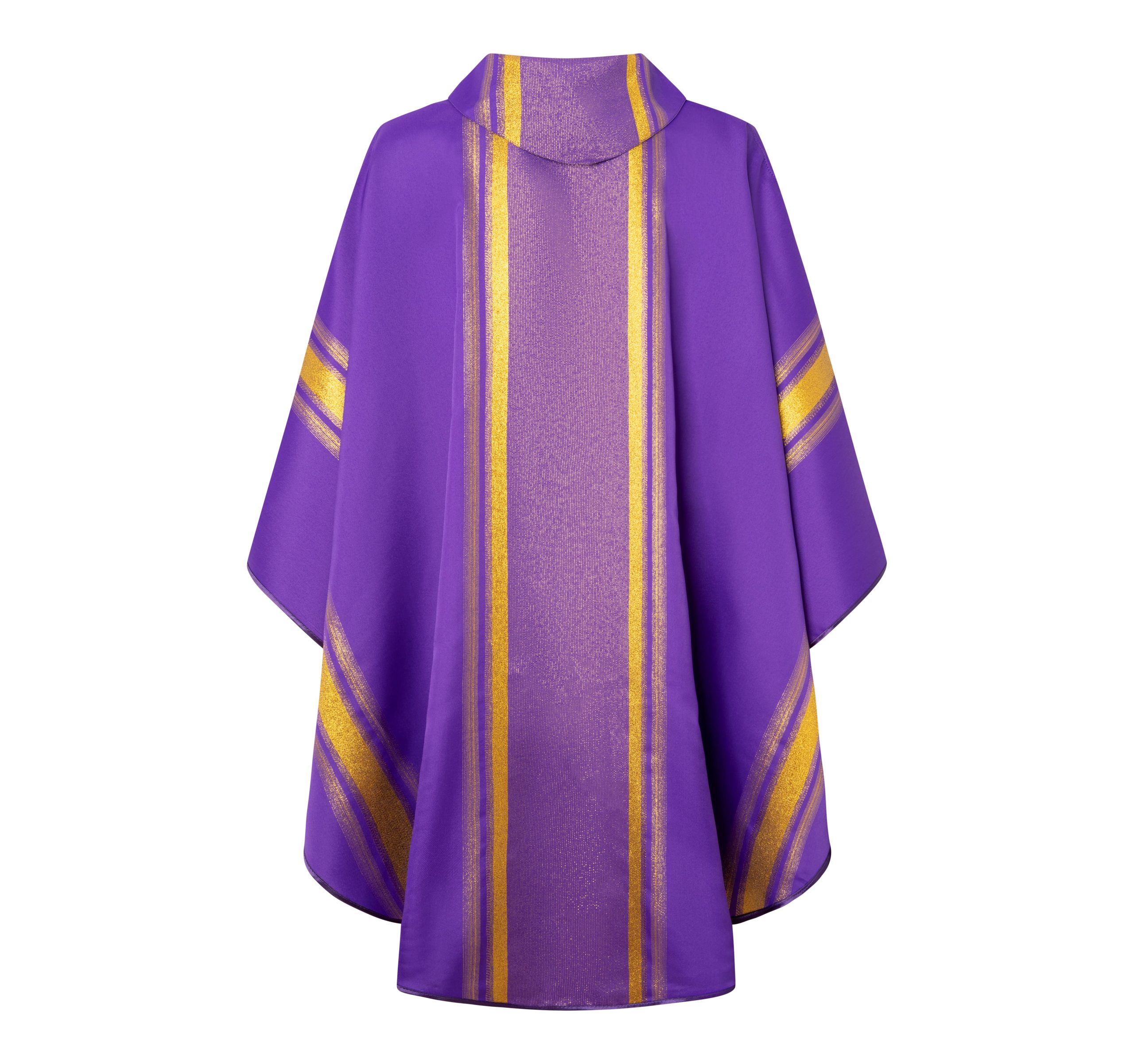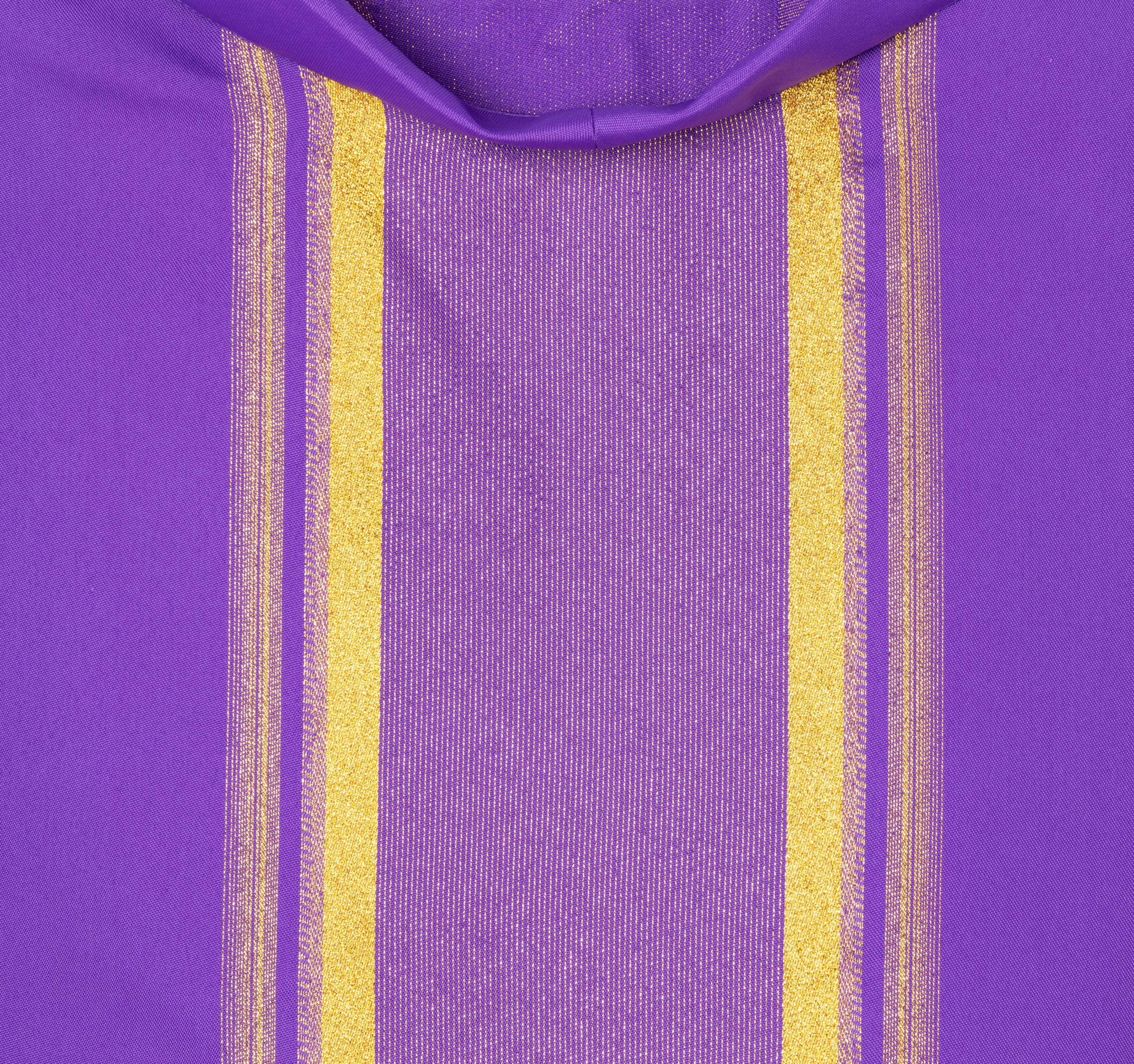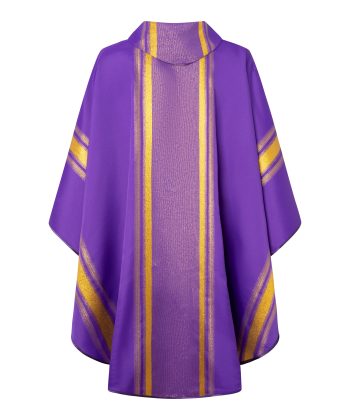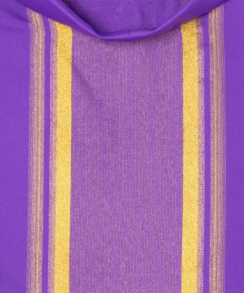 Casulla de sacerdote violeta con líneas doradas.