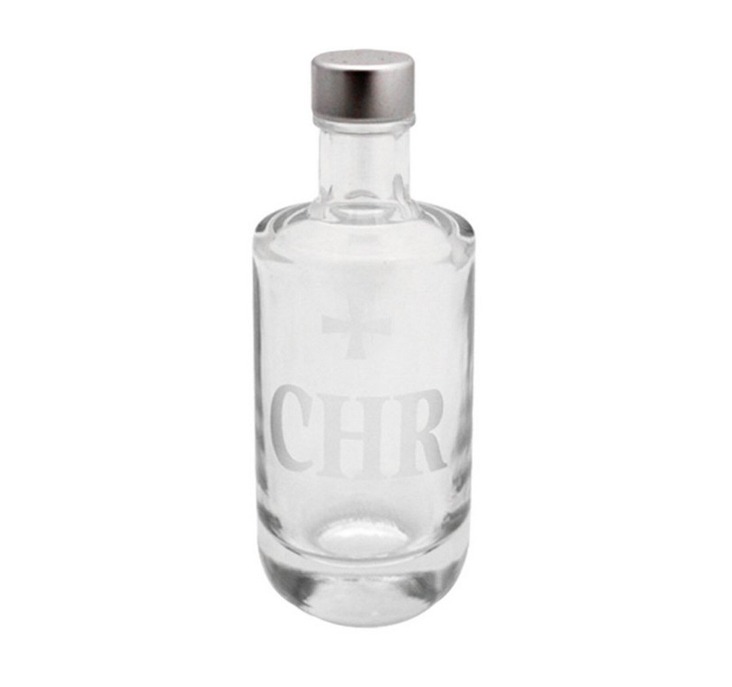 El tapón metálico aporta un cierre seguro que protege el contenido, evita derrames y contribuye a la conservación del óleo en condiciones óptimas. A su vez, el grabado en el cristal otorga al conjunto una presentación cuidada y solemne, acorde con el uso litúrgico al que está destinada.