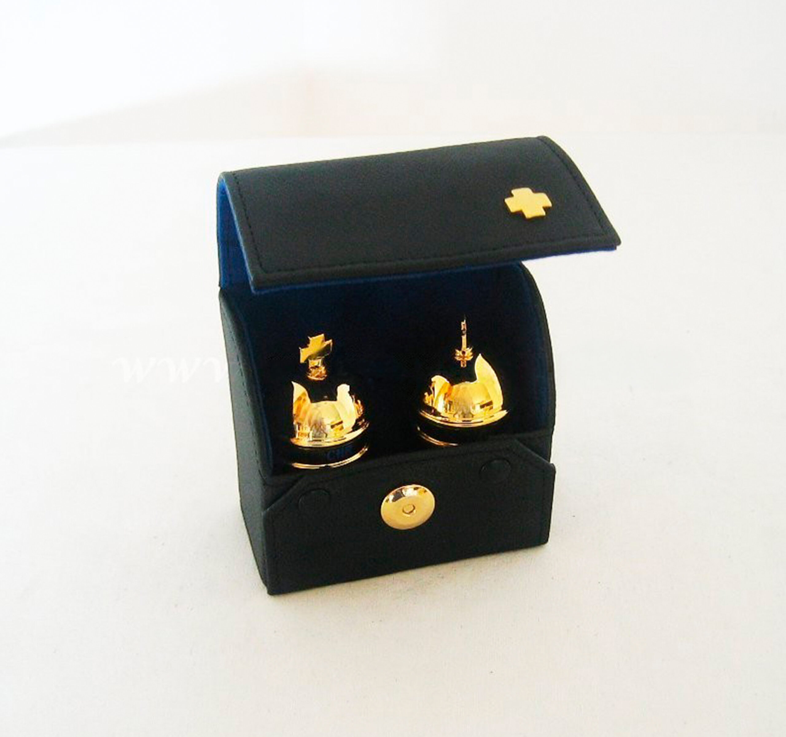El estuche protege las crismeras del desgaste y los golpes propios del uso frecuente, garantizando que lleguen a cada celebración en perfectas condiciones. Su formato compacto lo hace fácil de incorporar en cualquier bolso pastoral, maletín o kit litúrgico de viaje, sin añadir peso ni volumen innecesario.