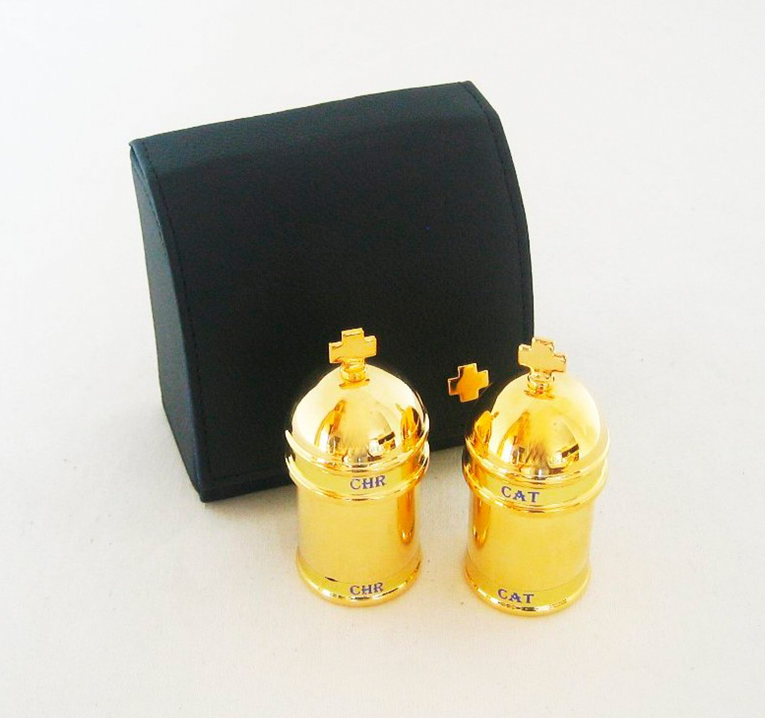 La Crismera Doble en Estuche de Cleronet es un conjunto de dos crismeras presentadas en su propio estuche, pensado para sacerdotes y ministros que necesitan transportar dos óleos litúrgicos de manera segura, ordenada y siempre a mano.