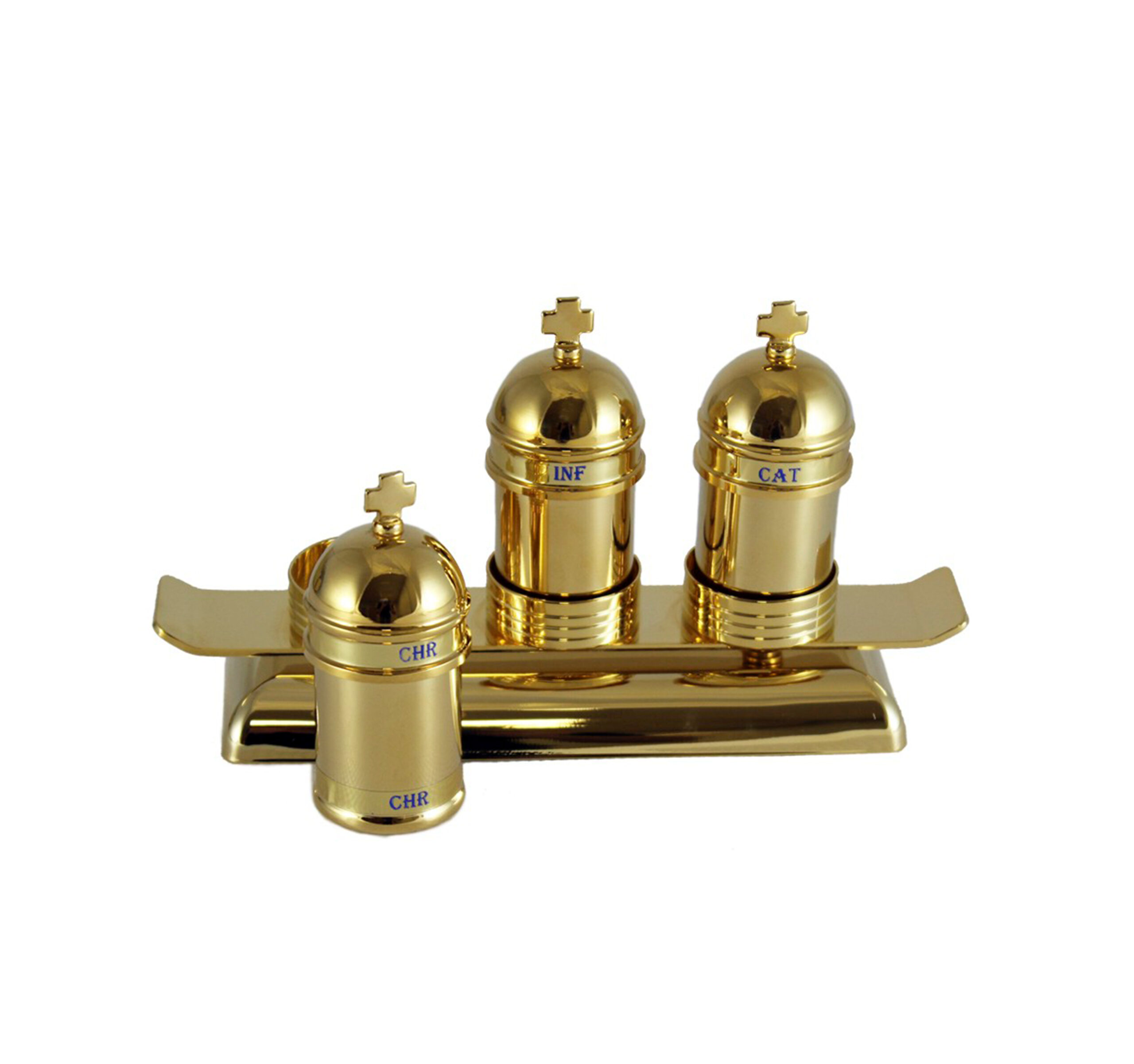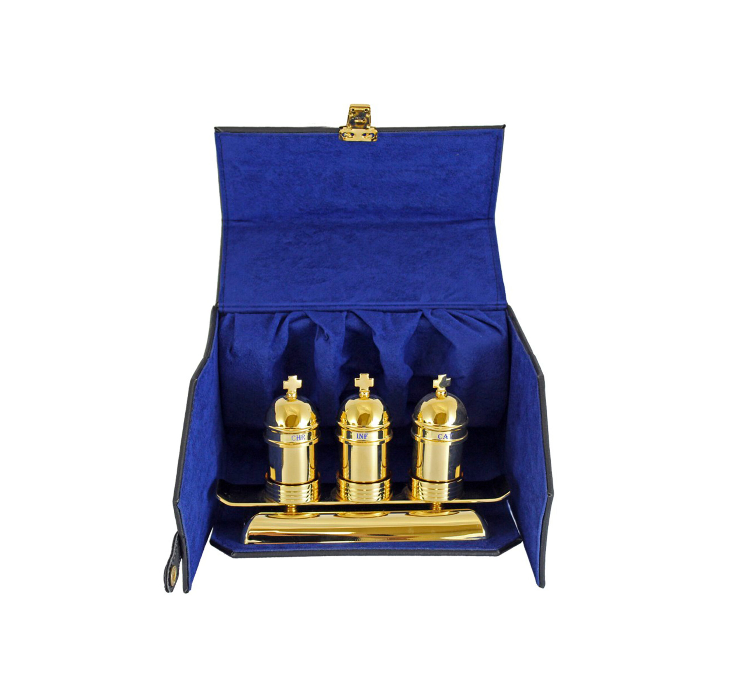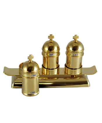 El soporte incluido permite presentar las tres crismeras de forma ordenada y estable, tanto durante la celebración como en la disposición del altar o mesa litúrgica. Su diseño coordinado con el estuche y los vasos dorados genera un conjunto visualmente armónico y de gran valor simbólico.