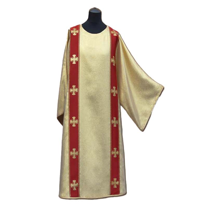 Dalmática diaconal dorada con doble estolón rojo decorado con cruces en color oro