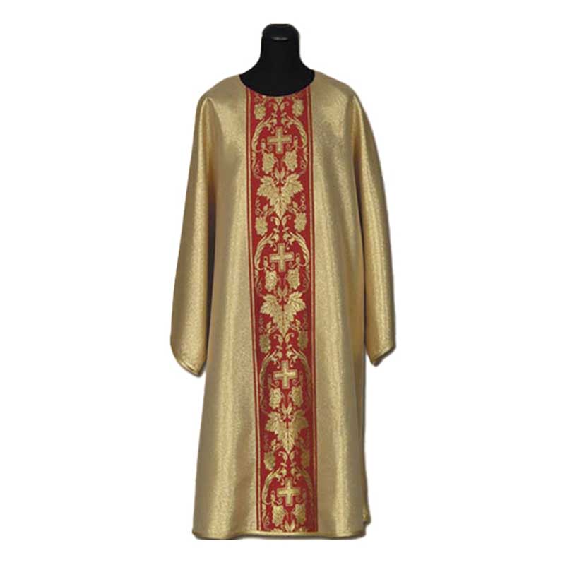 Dalmática para diáconos dorada con estolón rojo decorado de espigas y cruces en color oro