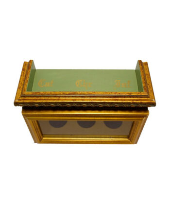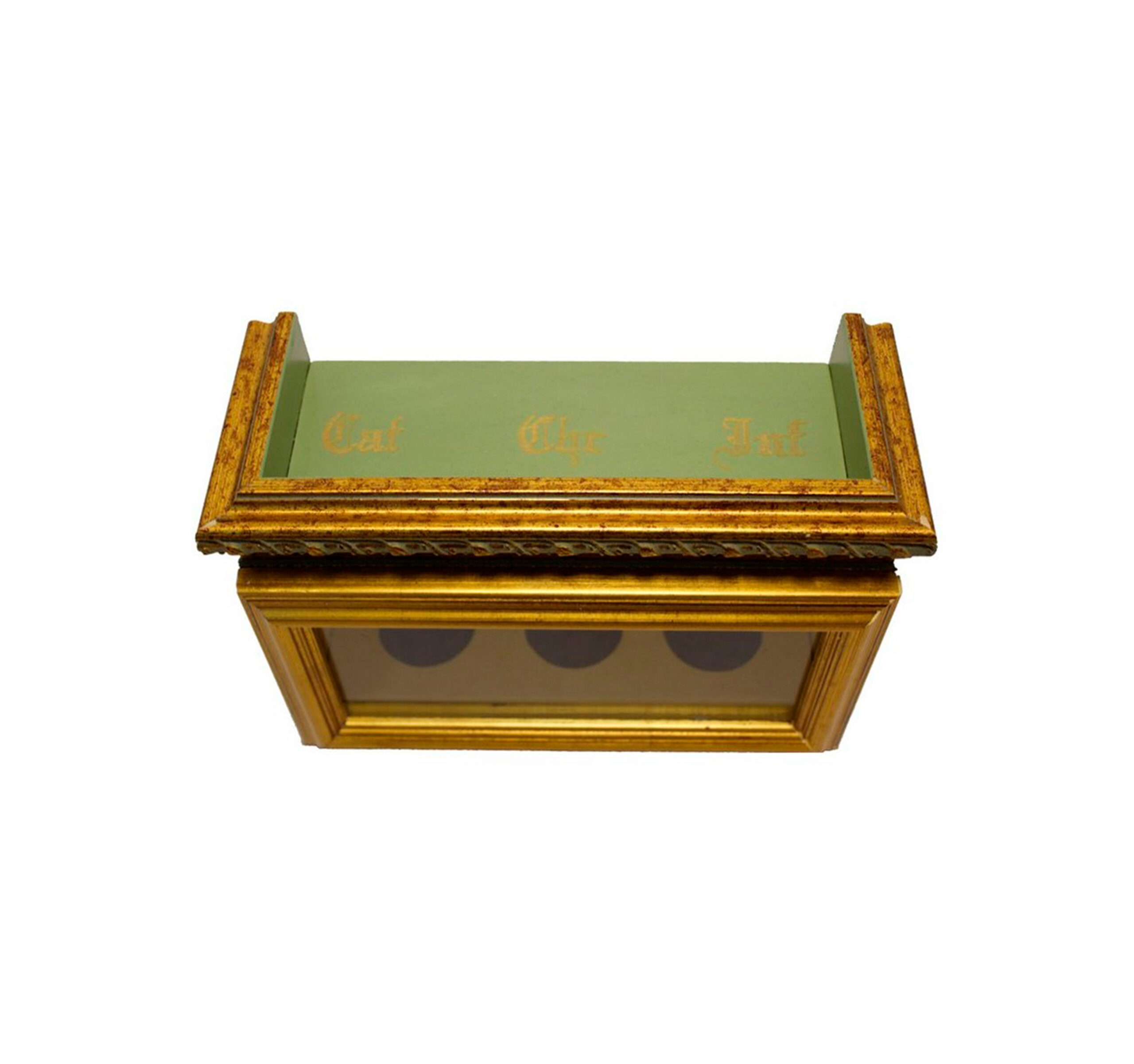 Con unas dimensiones de 30 cm × 23 cm × 14 cm, ofrece el espacio necesario para alojar las crismeras con comodidad, protegiéndolas del polvo y el desgaste sin ocupar demasiado lugar en el mobiliario litúrgico.