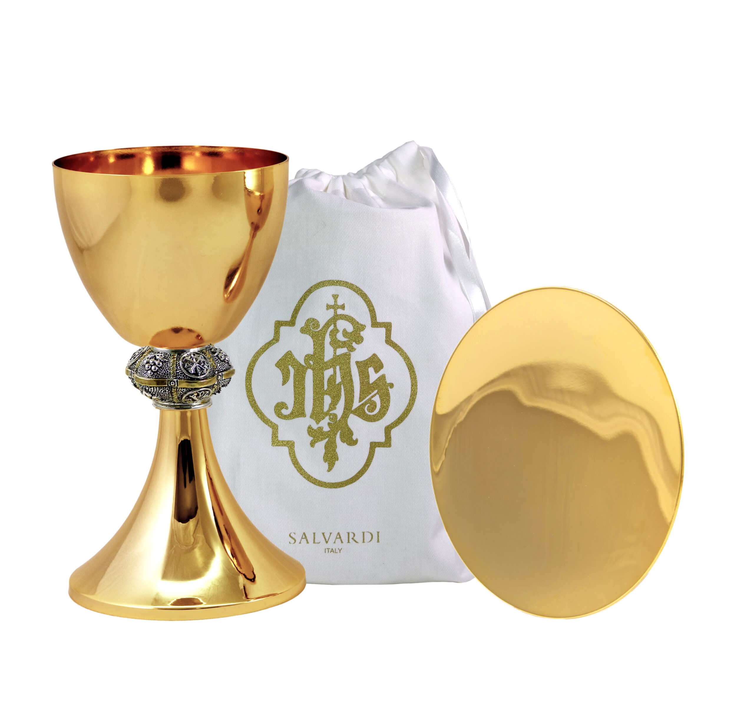 – Cáliz dorado con un precioso nudo decorado con racimos de uvas y el símbolo Alfa y Omega en acabado plata y oro bruñido. 20 cm de alto y su copa tiene un diámetro de 10 cm, con una capacidad de 350 ml.