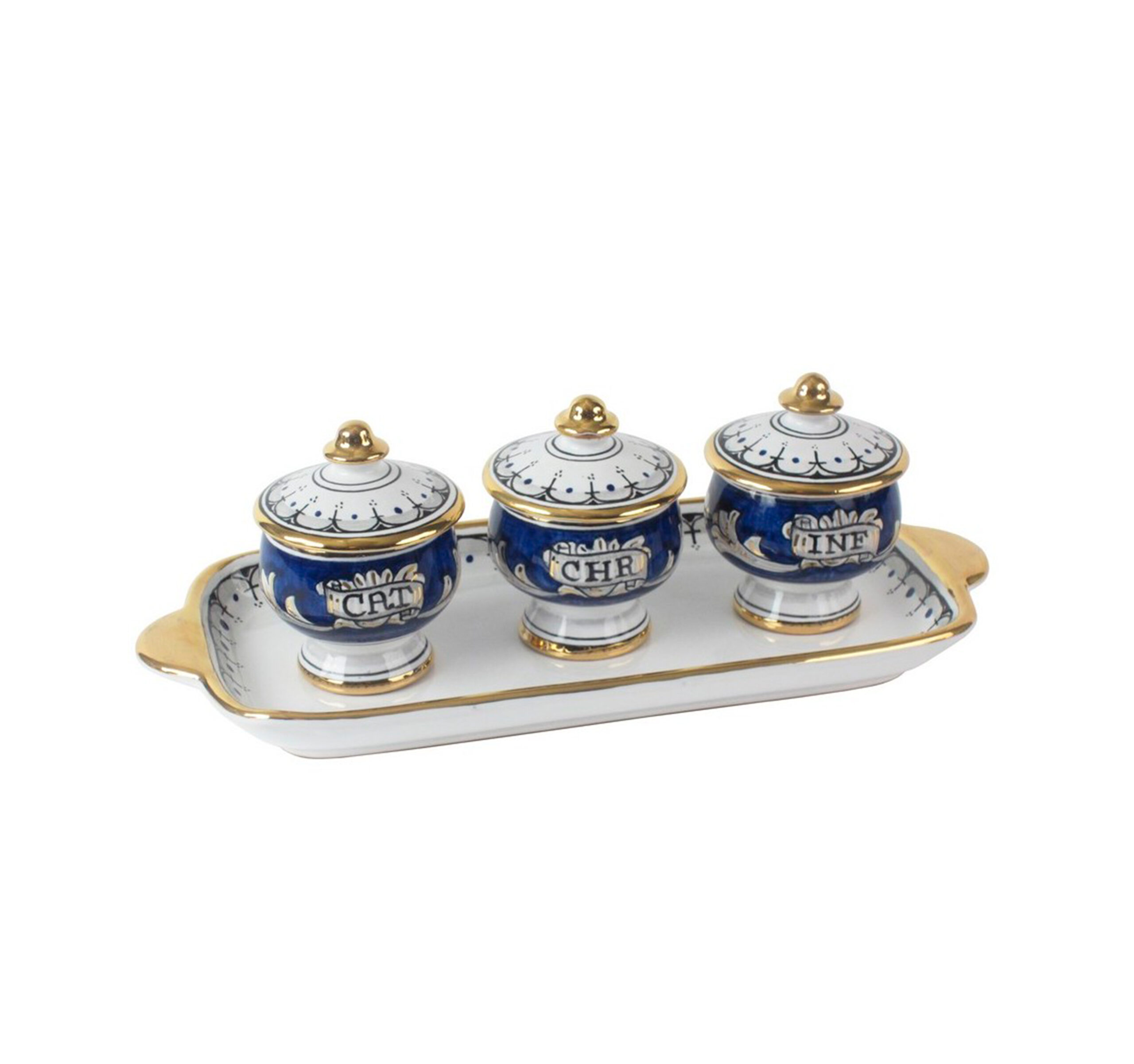 Juego de Crismeras de Cerámica con Bandeja Azul y Cruz Dorada