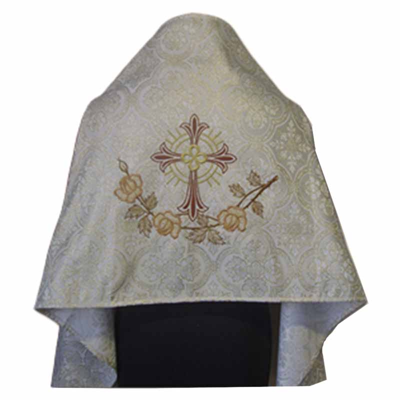 Paño de hombros litúrgico de color dorado con un bordado en diferentes tonalidades de los siguientes signos católicos. Cruz en matices rojos y dorados y con forma de custodia, Una rama de rosas en colores verdes y rojo rosa.