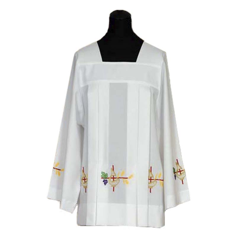 Roquete sacerdote bordado con cruz, uvas y trigo.