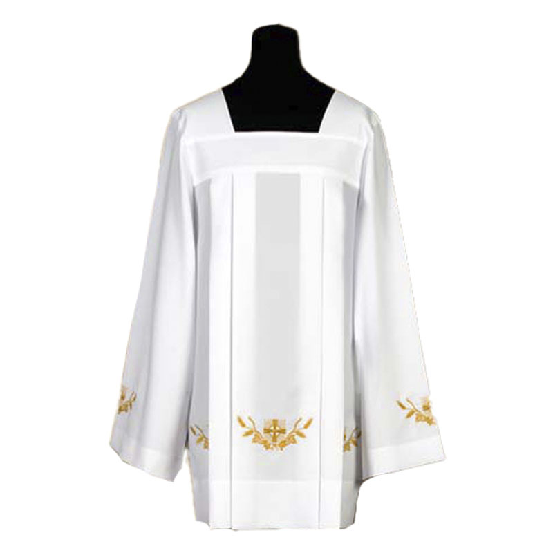 Roquete sacerdote bordado con cruz y trigo en dorado.
