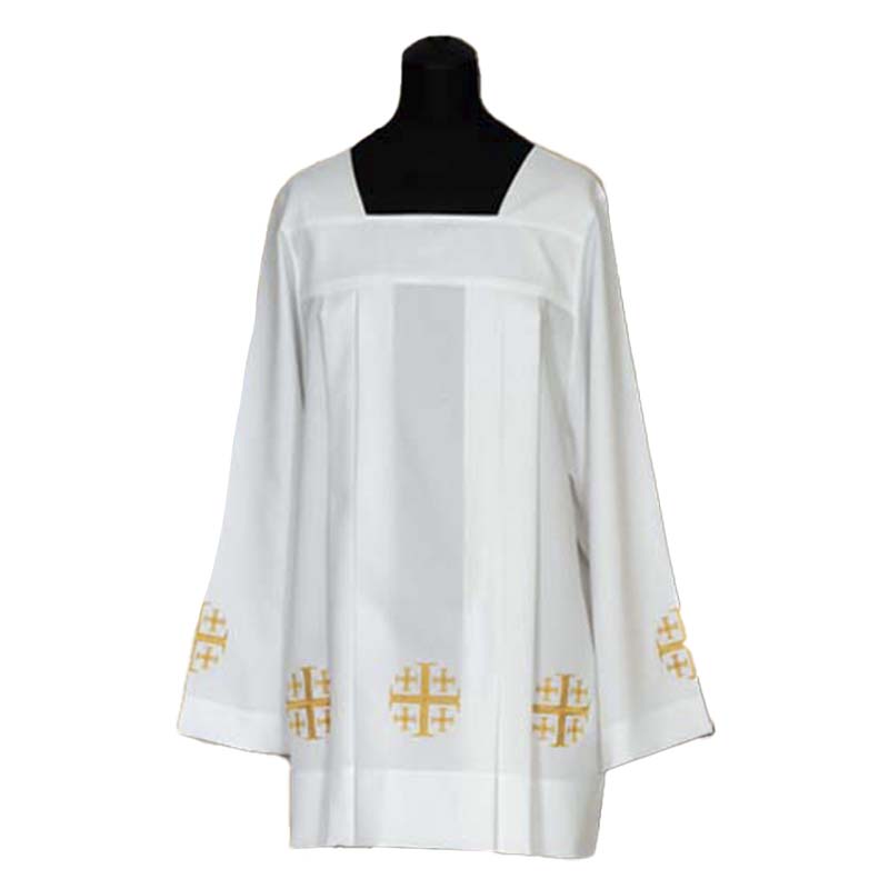 Roquete sacerdote bordado con patrón de cruces en dorado.