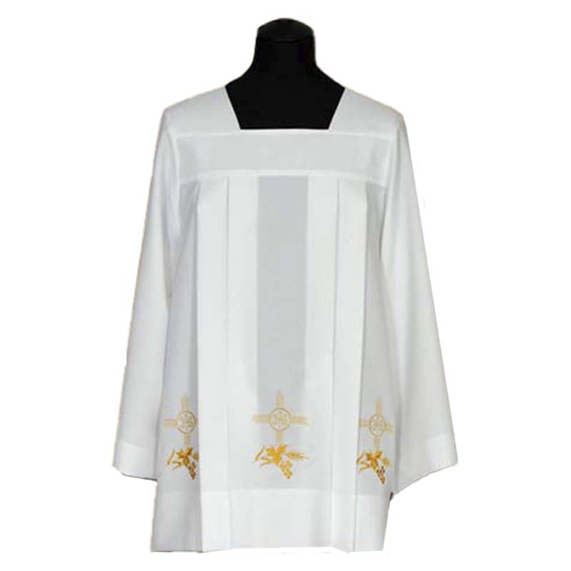 Roquete sacerdote bordado cruz JHS y uvas en dorado.